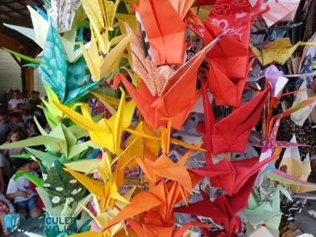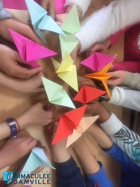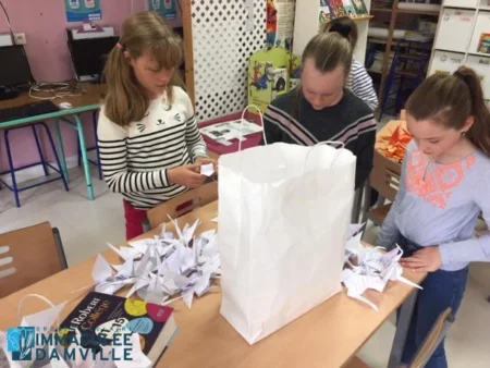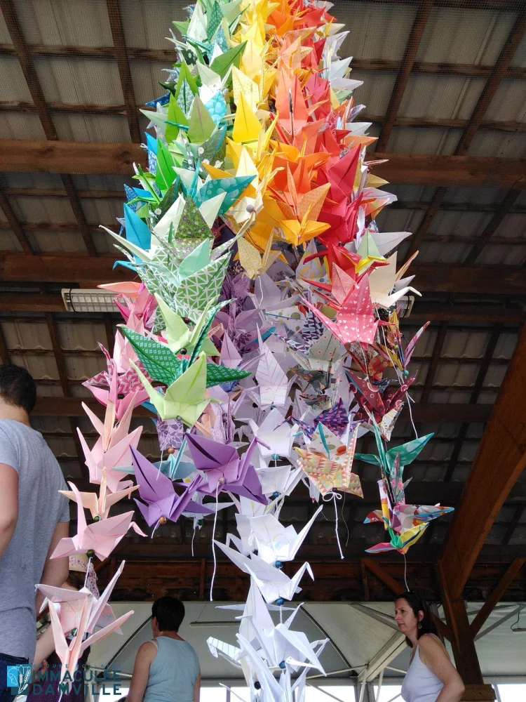 Il y a quelques années, les élèves de l’Immaculée avaient été invités, par le club de lecture de la BCD, à pratiquer l’origami en pliant des grues, cet oiseau si symbolique au Japon, suite à la lecture des 1000 oiseaux d’Hiroshima d’Eleanor Coerr. Ce livre retrace la courte vie de Sadako Sasaki, une fillette frappée par la maladie de la bombe, la leucémie, quelques années après le bombardement d’Hiroshima.