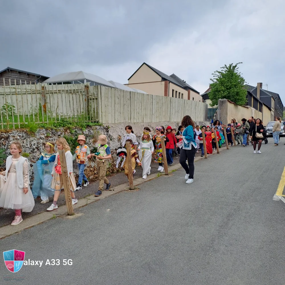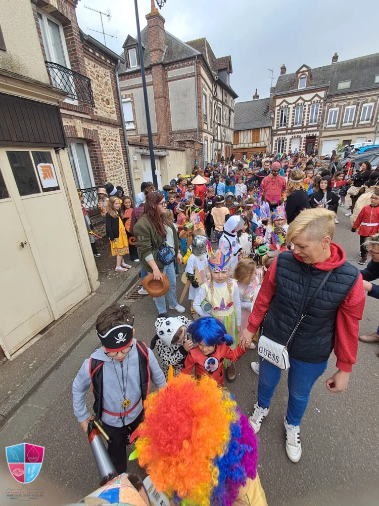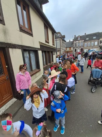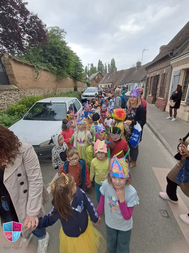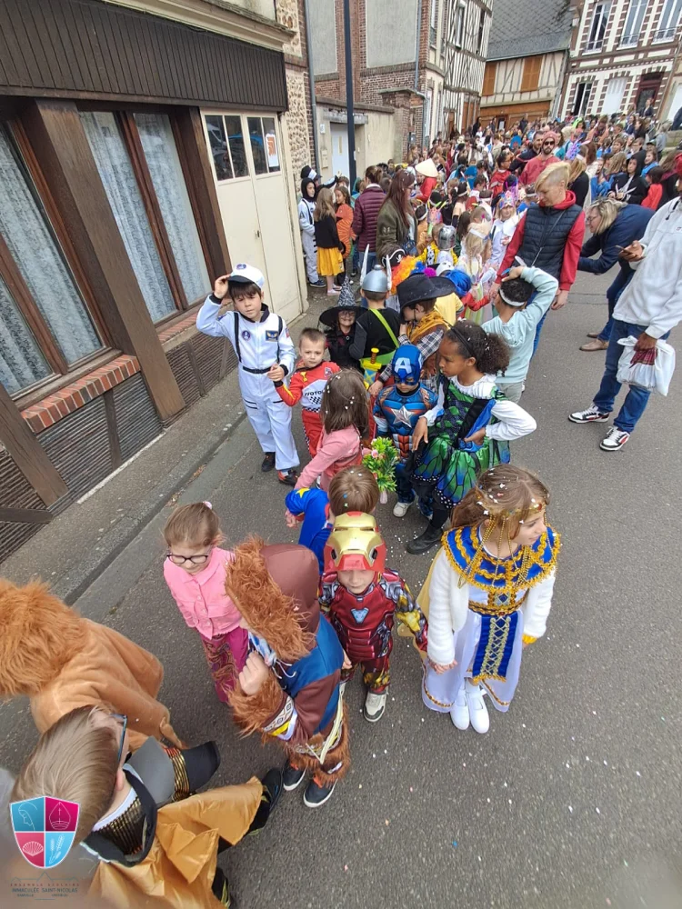 Jeudi 24 avril tous les élèves de la petite section au cm2 ont participé avec enthousiasme au carnaval. Les enfants vêtus de magnifiques costumes ont défilé avec fierté dans les rues de Damville. Un immense merci aux élèves pour leur créativité, aux enseignants pour leur implication et aux parents accompagnateurs pour leur précieuse aide tout au long du défilé. À leur retour, les enfants ont pu savourer une délicieuse crêpe accompagnée d’une boisson, offertes généreusement par l’APEL, que nous remercions chaleureusement pour leur présence et leur engagement. Bravo à tous pour cette belle fête !